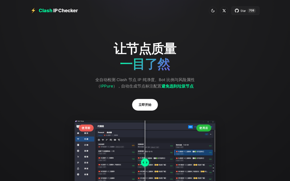 Clash IP Checker is a tool designed to automatically evaluate the quality of Clash nodes by assessing the purity, bot ratio, and risk attributes of IPs through integration with the IPPure data source. This ensures a clear understanding of node quality, helping users avoid selecting subpar nodes. The tool automates the process of switching nodes and conducting tests via the Clash External API, eliminating the need for manual intervention. It supports resuming from where it left off in case of interruptions and retries failed tests automatically.