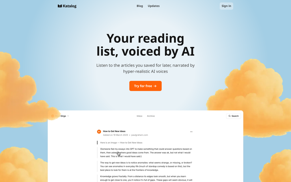 Katalog is an innovative "read-it-later" app that allows users to save online articles and revisit them with a unique, audio-first experience. By simply pasting a link, users can store the content of any article, ensuring access even if the original webpage becomes unavailable. The standout feature of Katalog is its high-quality AI narration, enabling users to listen to saved articles rather than reading them. While listening, users can interact by asking questions, taking notes, or highlighting key points, making it an engaging and productive tool.