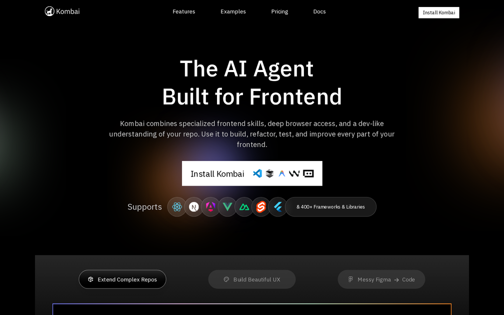 Kombai is a domain-specific AI designed to excel at frontend development tasks, surpassing the capabilities of generic coding agents and frontier models. It enables developers to build complete app UIs, refactor code, or create components directly from diverse inputs such as Figma designs, text, images, or code snippets. Unlike general-purpose solutions, Kombai is tailored for real-world frontend development, offering superior fidelity, code quality, and development velocity.