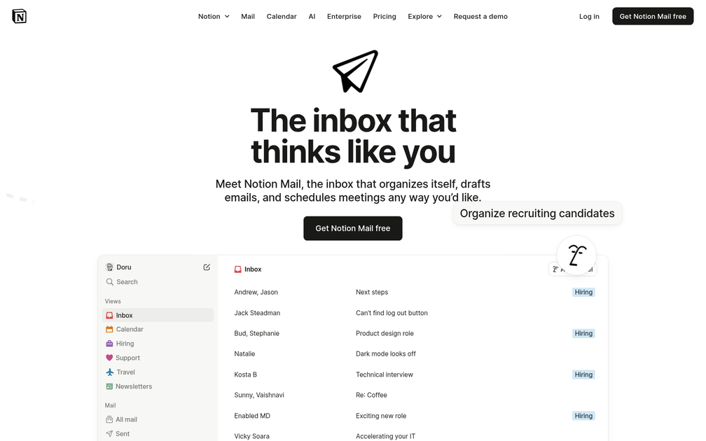 Notion Mail is an innovative email management tool that integrates with Gmail to offer a highly customizable and efficient inbox experience. It leverages AI to automatically organize, draft, and schedule emails according to user preferences. This tool allows users to create custom views by filtering emails based on various parameters such as domain, calendar, label, and sender, making it easier to focus on essential communications.
